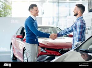 Buyer of the car shaking hands with the seller in the auto dealership. Close-up of handshake of business people.